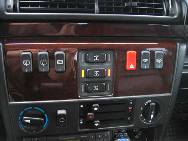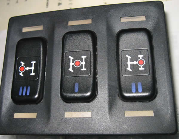 室内センターコンソール(この個体はABS解除SWなし) センターデフロックSW押すと最初に左の黄色が点灯。数メートル走ると右の赤が点灯し正常作動しています。 その時ステアリングを大きく切ると4WDのブレーキ現象が起こりました。正常です。