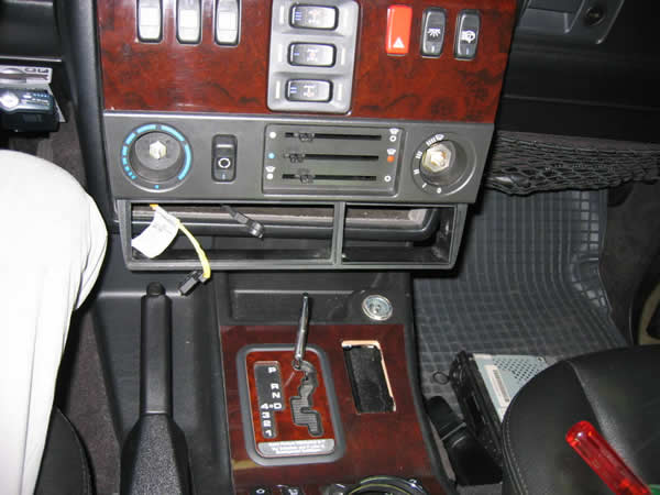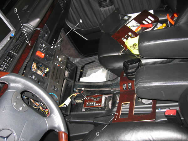Aのセンターパネル外すにはシフトノブを外してからシフトパネル周りの四角いカバーを外しHI/LO切り替えレバーのブーツめくって隠れた所にあるビス1本外せばCのウッドパネル、後ろ側から持ち上げて手前に引けば外れました。 次にBのウッドパネルを右端から慎重に引き出し(樹脂製のファスナーではまっている)その下からAを固定しているビス3本外しました。 更にカーステレオとその右にある小物入れ外すと両側にボルトがありました。 空調パネルや温度調整ダイアルは引き抜いて奥にあるナットを外しました。 これでようやくデフロックスイッチのあるウッドパネルを外すためのスペースが出来ました。 |