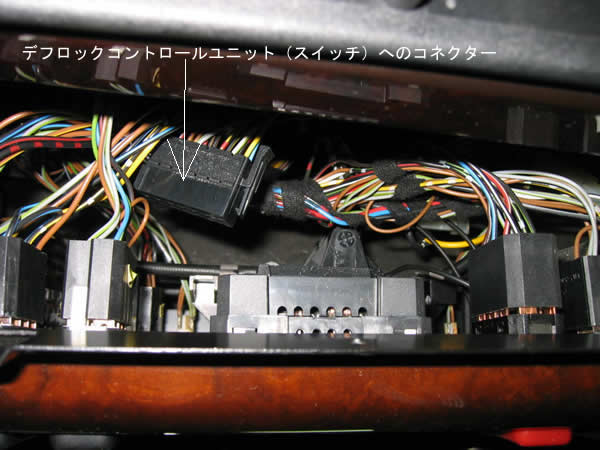 配線や空調のワイヤーなどがありますが、とにかくデフロックスイッチ裏のコネクター(矢印)を抜きました。