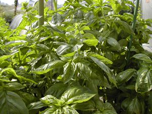 バジル:スイートバジル シソ科 1年草 原産地熱帯アジア イタリア料理にはかかせません。我が家ではパスタにはもちろんドレッシングにも使っています。トマトソースやジェノベーゼソースなどなど・・ 寒さには弱いので5月上旬に苗を入手し南向きの保水性がある土壌に植えます。10cmほどになったら先の芽を摘むと枝分かれし収穫量が増えます。花をつけたらこまめにつむと秋まで収穫を続けることが出来ます。 |