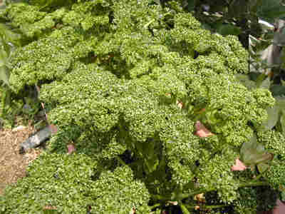 パセリ:モスカールパセリ セリ科2年草 大きな株になると雪の下になっても春には収穫が出来ます。 これも料理の付け合せにはかかせません。お店で買うものよりも香りが強く柔らかいものが収穫できます。 |