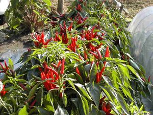 トウガラシも沢山赤いサヤをつけます。これは自家製のラー油や炒め物のスパイスとして重宝します。自家製ラー油の作り方はこちらで紹介しています。 |