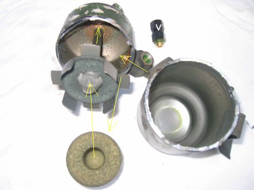 黄色の線が冷媒の経路 タンクの厚みは1.5mmほどあり高圧に耐えるようになっている。 V:は異常高圧の場合のリリーフバルブ |