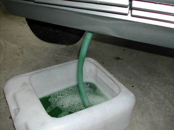 EXタンクのキャップ外してからアンダーカバー外してラジエタードレンコックからクーラントを抜く 画像のようにホースをつけるノズルがあり、こぼさずに排出できます。内径11mmほどのホースならピタリです。 |