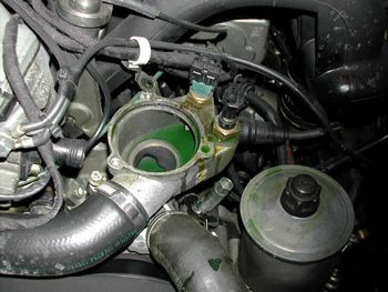 サーモスタットを抜いたところ 内部にはLLCが残留している |