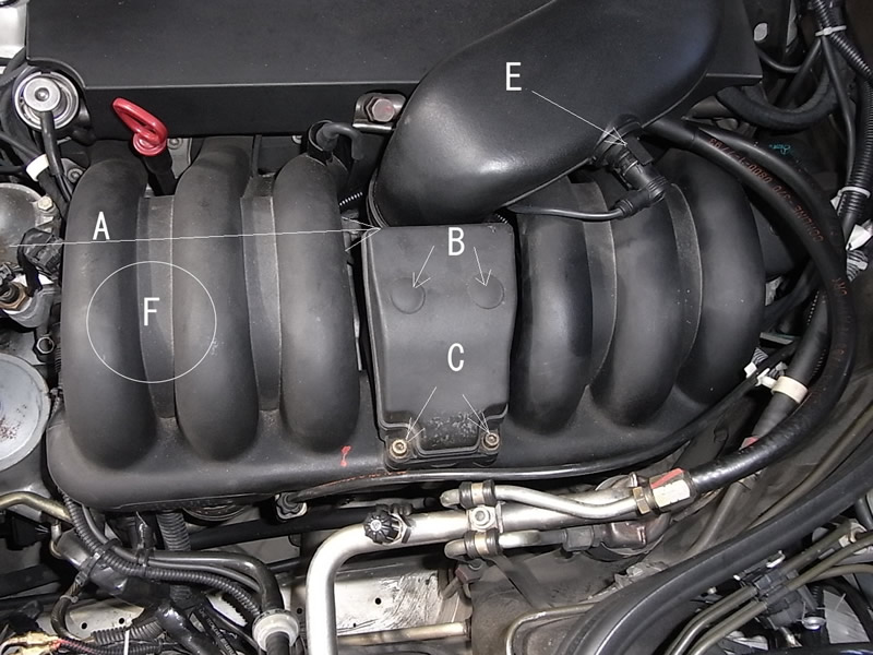 工具 1の ロングドライバーでAのあたりからインマニ下を通しダクトを締めているホースバンドゆるめる。Eの吸気温度センサーを抜く。