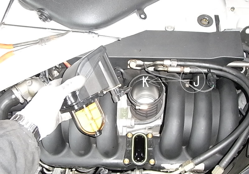 次はスロットルアクチュエータとインテークダクトをつなぐゴムの部品、インシュレーターを外します。私は工具2の1/4sqロングエクステンションにユニバーサルジョイント付け7mmのソケットでJあたりからKの下を狙いホースバンドゆるめます。ゆるめたら力が必要ですがインシュレーターが外れます。(このとき暖機運転後で暖かいならば外しやすいです) 手が細い方なら工具4の板ラチェット+プラスビットでゆるめることができるかもしれません。