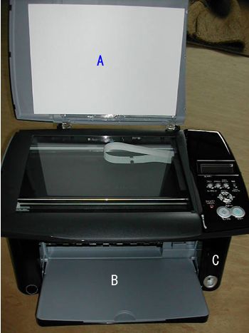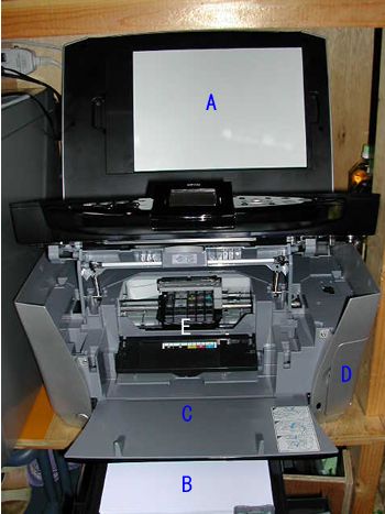 A.スキャナー部分のフタ インクタンクは黒のみ(顔料)別でカラー(染料)は3色一体型。 |