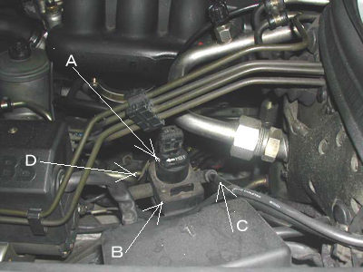Cは左Fフェンダー内にあるチャコールキャニスターからの配管
