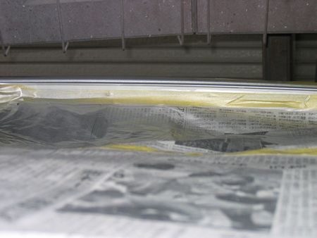 室内にサンドブラストのビーズが入らないよう毛布たシーツ敷き詰め社長自らサンドブラストかけています |