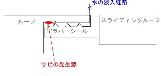 拡大するとこんな感じ。 サビの原因を予想してみると、ラバーシールが硬化して隙間が出来た。一応水が入らないようシールには山がいくつかあるが隙間が出来て一旦水が入ると乾きにくい。 その結果塗装が弱いところからサビが発生。そんな推理が成り立ちます。