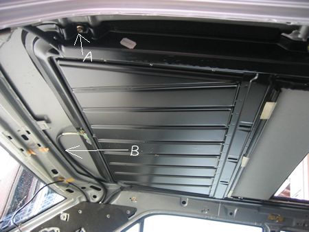 天井内装外したらスライディングルーフユニットの全貌が見えます(ここはリア側) Bはトランクルーム左から伸びているワイヤー。これは今回そのままにしておきます。 Aは固定ボルト。ここのみ左右M6ボルトですが他はタッピングビスにて固定されています |