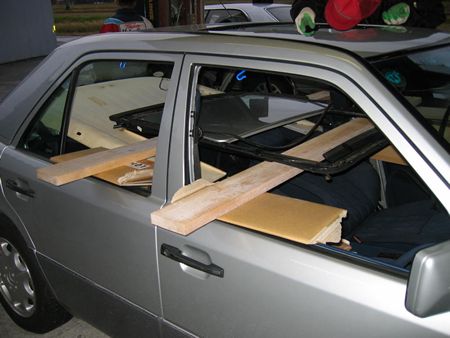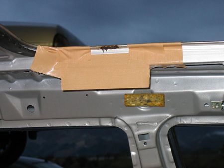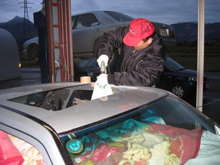 どうやっても車外に出せないので(組み立ててからウインドウシールドを取り付けていると思う)窓を全開、ドアに角材を置きその上にスライディングルーフユニットを置いた。(これも工場スタッフのアイディア) 後ほどフロントシートとセンターコンソールを外せばスライディングルーフユニットをそっくり車外に運び出せると聞きました。 開口部内周に付いているラバーシールは引っ張れば外れました。 画像はサビのある場所をチェックしている工場のシャチョーです |