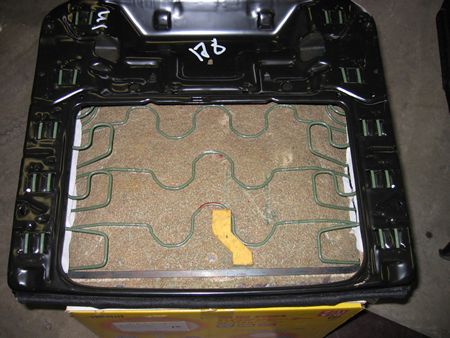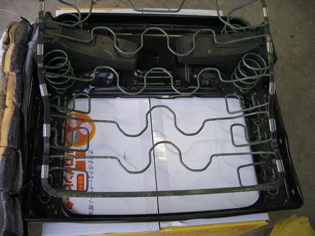 ぐるーっと1周外すと中の金属フレームと分離 コイルは前方のみ4箇所で「おしり」の下になる所にはコイルスプリングがありません。 これが落ち込む原因でしょうか? |