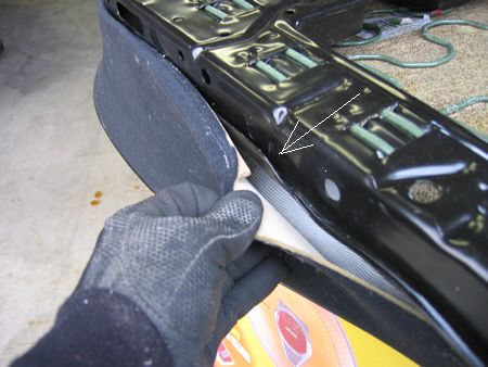 上からヒザで押してクッションを縮め表皮の固定を外しました 矢印部分に挟まっているだけです |