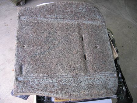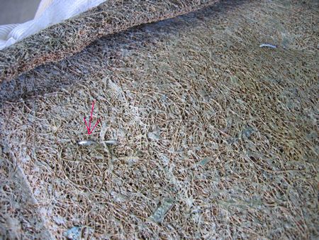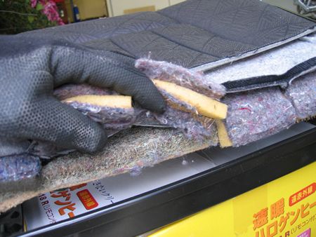 表皮をめくってみるとヤシの繊維を固めたパッドとその上のウレタン+フェルトパッドが見えました |