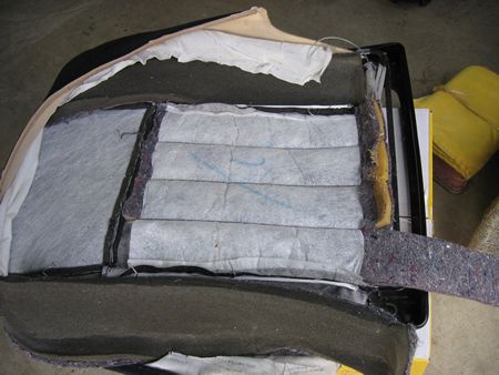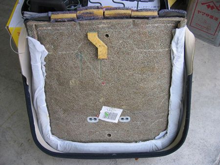 表皮に縫い付けてあるウレタン+フェルトのパッド これがつぶれて弾力を失っているようです これを参考に入れ替えるパッドの素材選定をしました。もしこのサンプルが無ければ自分のクルマのシート外して分解調査などに時間がかかり乗ることが出来なくなるところですが大変助かりました。 |