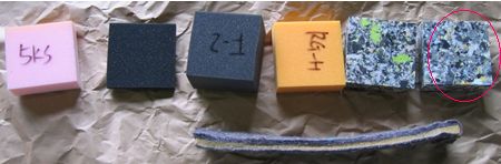 ウレタンパッド専門の業者さんからサンプル取り寄せてみました。 右の2個がチップウレタンといって一般的な形成シートの内部にも使われているようです。 赤丸が固い方のチップウレタン。しっかりとした硬めの感触でシートにはピッタリという感じ。これに決めました。 下は10万km熟成、弾力がお亡くなりになった表皮に縫い付けてあるパッド。ファブリックは蒸れなくて冬暖かでいいのですがフェルトを使っているのでシート表皮にホコリも出るんです。 |