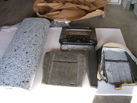 バラしたシートと購入したチップウレタンマット(厚さ22mm特注品) これで事前調査と素材の手配が済んだのでyama号のシートリフレッシュに挑戦です。 |