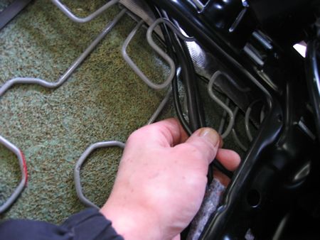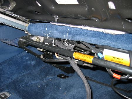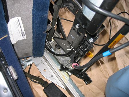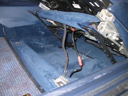 ステアリングは前方へ引っ込めてからバッテリーのマイナスターミナルを外しました。(エアーバック警告灯の点灯防止) シート前をゆっくり持ち上げ配線を外します。 矢印はシートベルトのキャッチ側からの線コネクター |