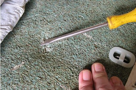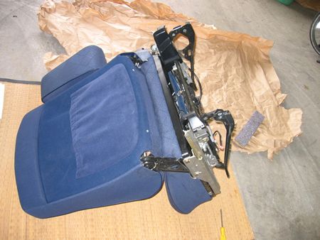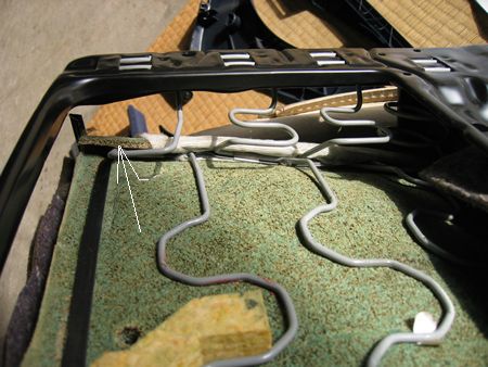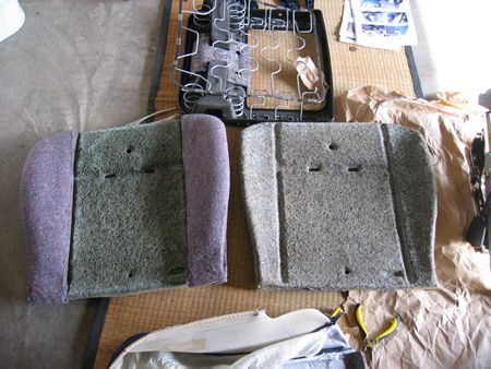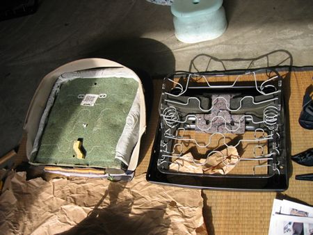 ヤシ繊維パッドの裏側からホッチキスみたいなのを外す。合計8箇所 右の白い部品は位置決め用らしい。ヒザでシートを圧縮しドライバーでこじると外れた。