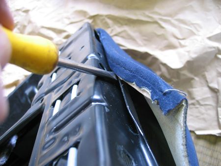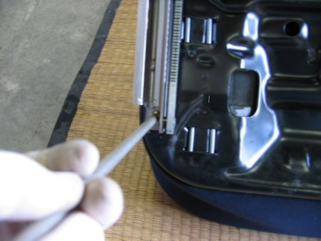 座面の表皮ははまっているだけ ドライバーできっかけを作りヒザでシートを圧縮しながら外していく |