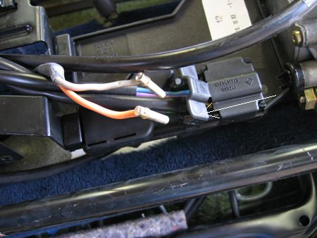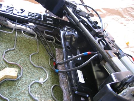 座面から背もたれまで配線が通っているので3本の配線を外さないと分離出来ません。 矢印部分マイナスドライバーで持ち上げグレー・オレンジの線だけ抜く |