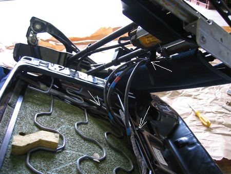 カバーをめくって2箇所のコネクターを抜きます(矢印)真上に引けば抜けるのですが固くて苦労しました。マイナスドライバーでこじるといいかも。 これでシートが分離できました |