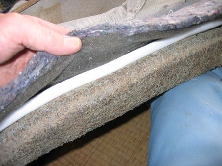 表皮にチップウレタンを入れるの図 これで表皮の中のパッド弾力の回復を期待して。 中々入らない(簡単に入るようではゆるすぎ)のでビニールテープを巻いて挿入。途中まで入れたら反対側から引っ張る 後ほど気がついたのですがヒモでしばってから入れる。反対側から引っ張り挿入完了したらヒモを切る。なんてのは いいかもしれません。もしトライされた方がいれば一報いただきたいです。 これを4本入れてOKとしました。 夏なら表皮を洗濯してから出来るのに・・・と思いましたが洗濯に耐える素材かは不明 2006.5.5追記 あらえびすさんから情報いただきチップウレタン挿入には アイディア+情報の提供ありがとうございました。
