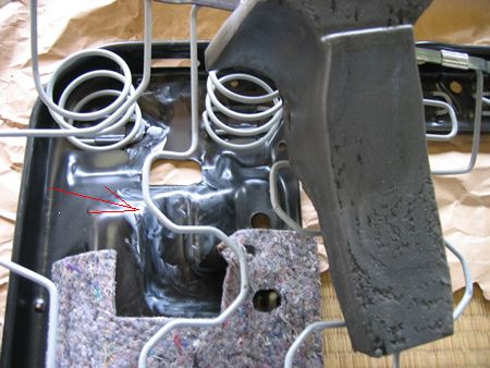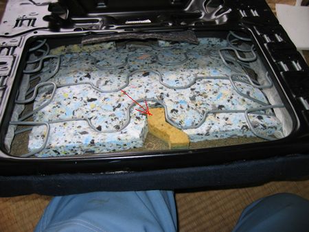 シート前側のコイルスプリングがあるところには黒い形成ウレタンンがあり路面が悪い所を走るとギシギシ音がしていたのでフレームにシリコングリス塗ってみた。赤い矢印 この黒いウレタンの上にもチップウレタンを1枚追加両面テープで固定しました。 (画像撮り忘れです) |