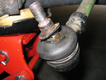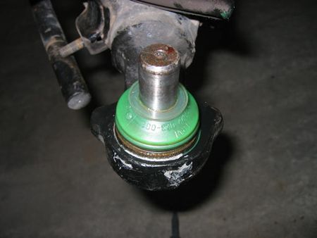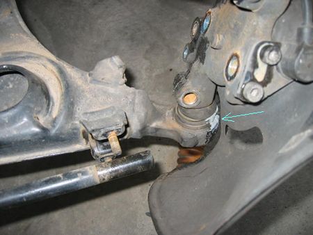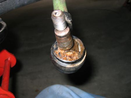 ボールジョイントブーツは矢印のあたりに亀裂がありグリスが滲んでいた。 しかし早期発見で水の混入もガタも無く、中は良い状態。ここも音の原因ではありませんでした。 |