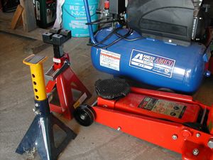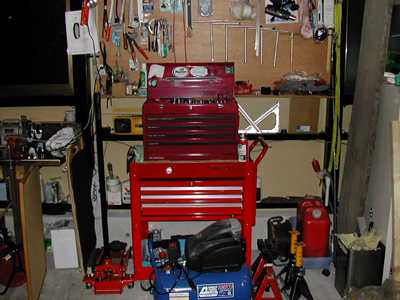 KTCミラーツールのチェスト+ツールワゴン、3tジャッキ、ウマ4台、イワタの1/2インパクト、コンプレッサー(25L)、自作クリーパー、奥のボードにはTレンチなど。 |