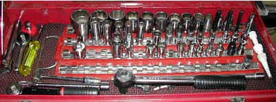 ごちゃまぜBOX。1/2Sqは12mm−32mm) 3/8Sqは7mm−15mm。2本のラチェットハンドルはファコム(72ギア)感触はすばらしいです。 |