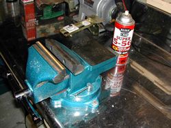 大型のバイス衝動買いしました(^^) 以前のは小さくて不便だったので・・・。ベースは4本のM8ボルトで固定したのでビクともしません。2箇所を緩めると回転します。このサイズで¥3980は安いです。早速可動部にグリス塗ります。 |