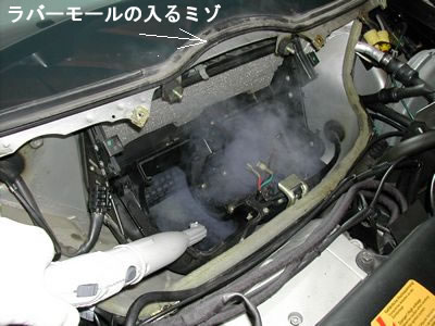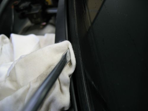 組み立ての時苦労するワイパー周りのラバーモールですがミゾをスチームクリーナーで掃除しマイナスドライバーにウエスを付けきれいにします。CRCなどの潤滑剤を吹きワイパーユニットをミゾより上に押し上げてから少しずつ下げながらはめ込むとうまく行きました。マイナスドライバーで押すことにより簡単にはまります。 ←ラバーモールのはまるウインドウ下部のミゾ掃除 |