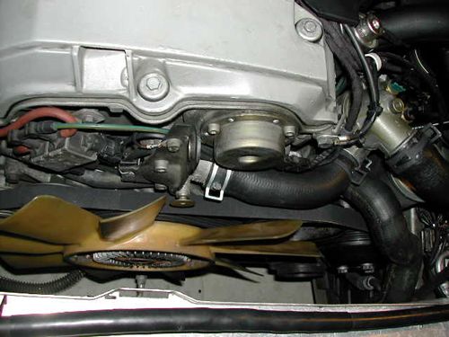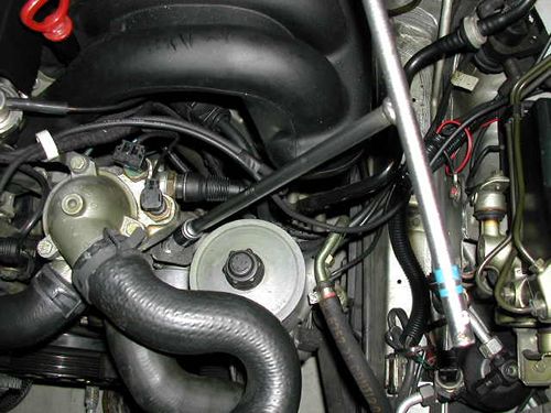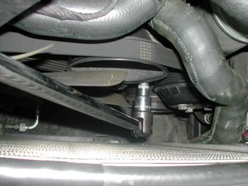 画像提供 「いのさん」どうもありがとうございます。 95年モデル(実際には94年9月以降生産)からのベルトタイトナーはこのようなタイプに変更されています。これに伴いベルトの長さも違います。またダンパーは必要なく ベルトの取り外しはベルトタイトナーのプーリー中心にある2面幅15mmのボルトにソケットレンチをかけ時計回りに回すとベルトにたるみが出て外すことが出来ます。 車両がJAPAN仕様の場合 BELT 010 997 89 92 (2475mm) このタイトナーは金属のコイルスプリングが内蔵されていてヘタることも無い構造です。もし消耗するとすればプーリーのベアリングでしょうけれど、これも径が大きく相対的な回転数も少なく旧式に比べれば2倍以上の耐久性があると思えます。 |