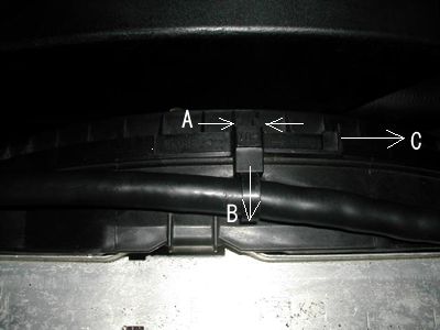 まずバッテリーのターミナルを外し(必ず) ファンシュラウドを取り外します。 Aのツメを内側に縮めB方向に引き抜く 次にC方向に回すとシュラウドが外せる |