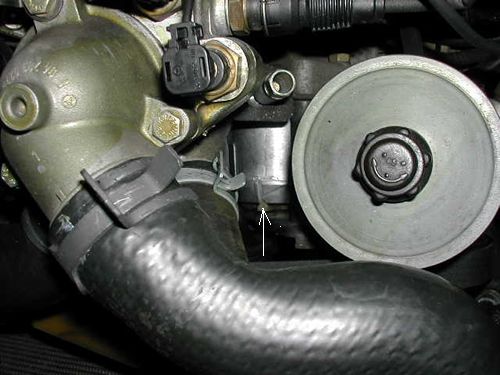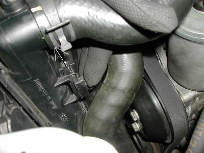 ラジエター左側 ラジエターホースTOPの下にあるツメを持ち上げる |