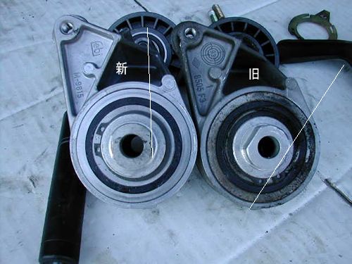 ベルトタイトナー新旧比較 角度でいえば30〜40度ほどねじれてしまっています。使用限界でした。プーリーも古い方は「シャー」と音が出ますが新品はねばるような感じ |