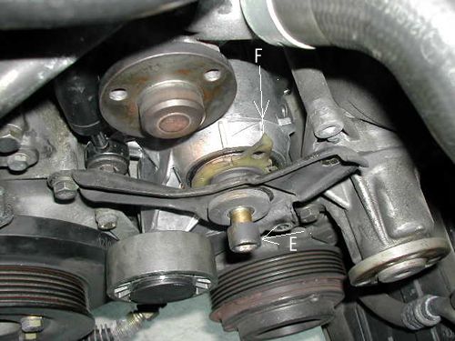 新しいタイトナーをセットしタイトナープーリーは上に上げておくテンションマークはFの位置で。 A/B/Cそれぞれのボルトを21Nmで締めたらウオポンとパワステプーリーを取り付けます。トルクは32Nmですが本締めはベルトを付けてから。 Eのロックボルトは最後に75Nmで締めます。 |