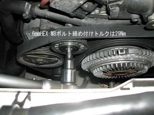 5mmHEX3本外しファンを取り外します/ここはM6なので締め付けトルクは10Nm. 次に必ずパワステ・ウオーターポンププーリーの固定ボルトを緩めておきます エアーポンプ上のアイドラープーリーのキャップを外し真ん中のある6mmHEX(M8)ボルトを外すとプーリーを取り出すことが出来ます。ここの締め付けトルクは29Nm