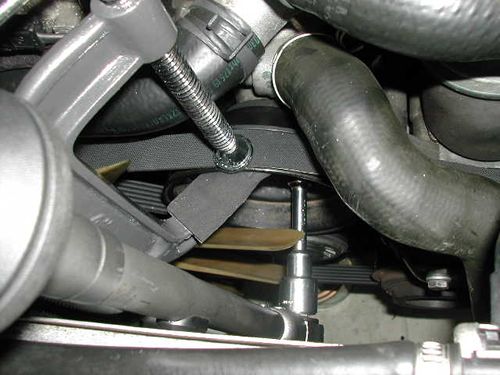 ウオーターポンプ・パワステプーリーを本締めします。トルクは32Nmなのですがプーリーが回ってしまいうまくいきません。 クランプで軽く締めてからやったらよーく出来ました。 パワステのプーリーは狭くてトルクレンチが入りませんので感で締めました。 |
