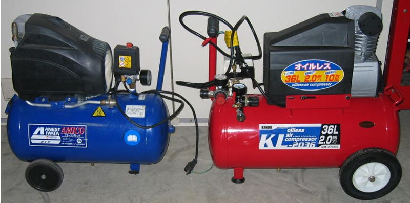 右:新潟の県央貿易が輸入しているオイルレスコンプレッサーKL-2036 タンク36L 最高使用圧力0.98Mps 消費電力1000W 空気吐出し量185L/min 意外なことに左のAMICO25に比べ音は若干静かですが住宅街の屋外で使うには はばかれる音量と思いました(92dBくらい) オークションで\27000送料込み 空気吐出し量がANEST IWATA のAMICO2の約3倍というのは本当か??見た目の大きさと消費電力から考えると計測方法に違いがあるのかもしれません。詳しい方または同じ機種使っている方がおりましたらコメント御願いします。 |