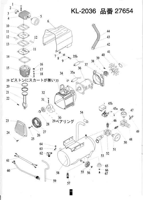 添付されていた説明書の中にパーツリストがありましたので掲載します。21のピストン/コンロッド1体でピストンにはすかーとがありません。ここの潤滑はどうやっているのか知りたいです。29はベアリングなので大丈夫そうですがシリンダーやピストン/リングの耐久時間はどれくらいなのか知りたいところです。