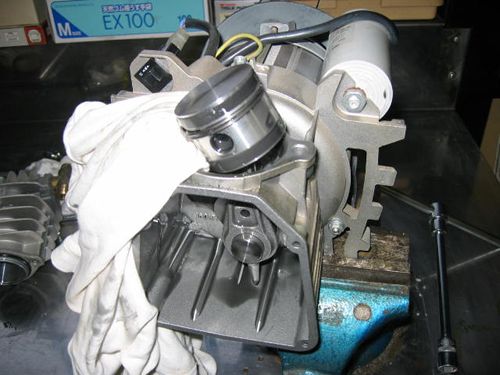 分解してピストンのチェック・・・焼きつきは無くキズも見当たりませんが・・・ 内部はアルミの削りカスみたいな銀粉がいっぱいのオイルがありました。相当磨耗が進んでいたようです。 |
