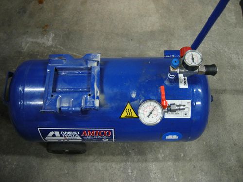 壊れたANEST IWATA のAMICO25というモデルはモーターユニットを外して軽量化。圧力計・加圧用カプラー・安全弁・レギュレーター・カプラーを取り付け改造。 これは移動用補助タンクとして使います。 |