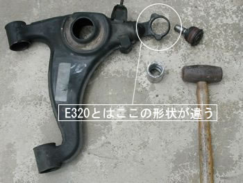 MB-USAのマニュアルによるとDOHC6気筒はコントロールアームのボールジョイントは溶接してある・・とあり信じていました。ところがある日はじめさんのガレージで320Eのロアアームを見るとE280とは明らかに形状が違います。ひょっとしたらE280は従来からの部品30E/260E/300E)と共通かもしれないと思いました(P/N見れば解りますが・・(^^)