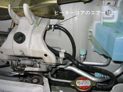 ボンネット開けた中央にエアー抜きホースがある(ディラーで親切に教えていただきました。) ヒーターコアは画像のところからホースを抜きエアー抜きする |
