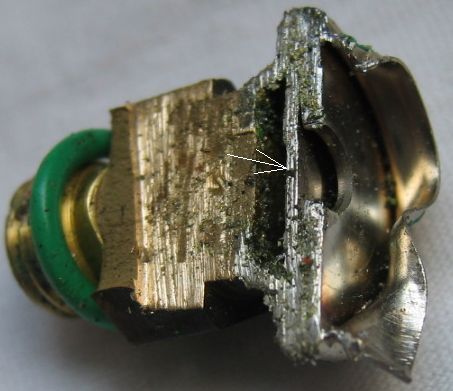 圧力で押し上げられた金属のダイヤフラムが矢印の白い突起を押し上げ2つの電極を導通させているようです。故障の原因は接点の損傷及び接触不良でしょう。