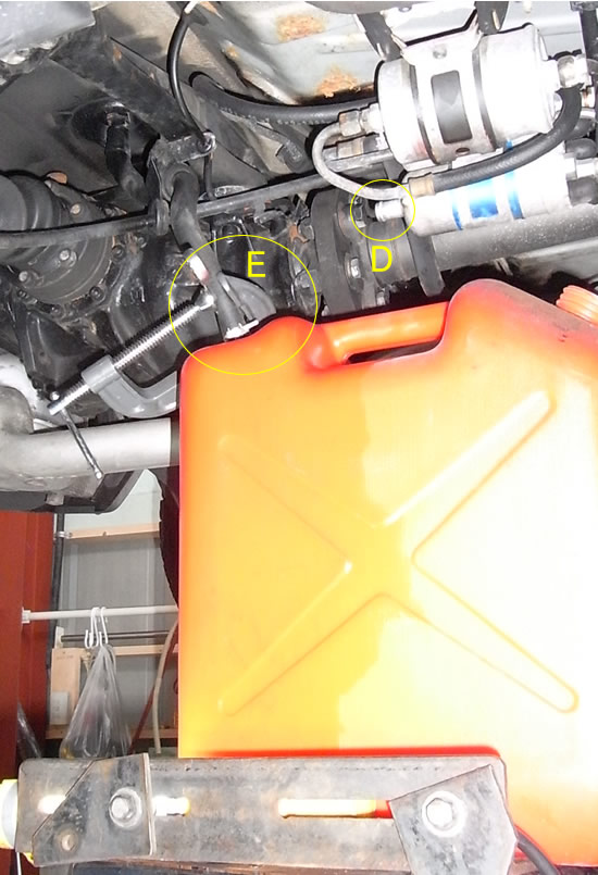 燃料タンクにはわずかなガソリンしかないはず。太いホースEをクランプで止め○のところでポンプから抜きポリ缶にガソリンを受けました。